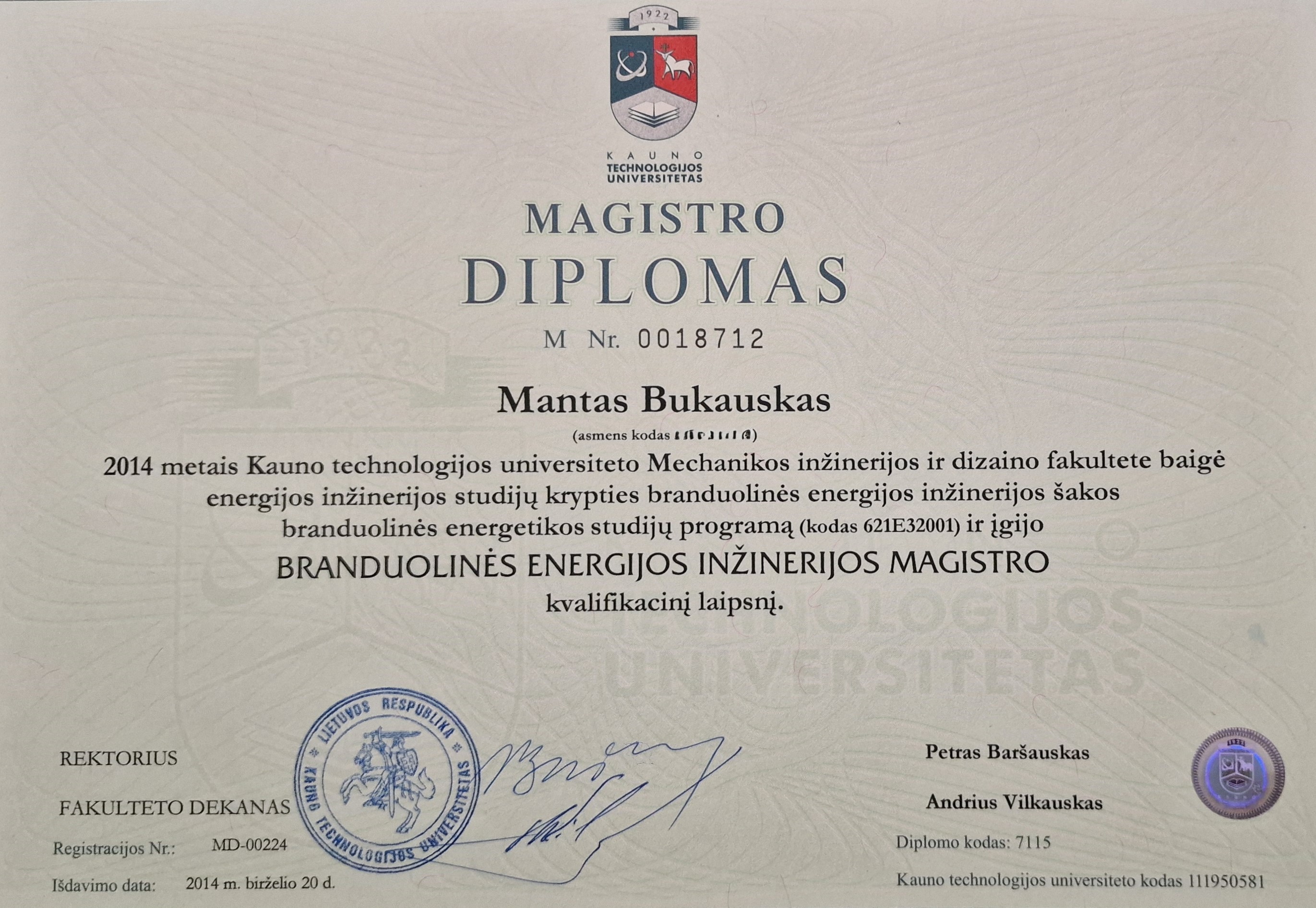 I have successfully completed my Master's degree studies in Kaunas University of Technology and aquired Master's diploma with honors.
